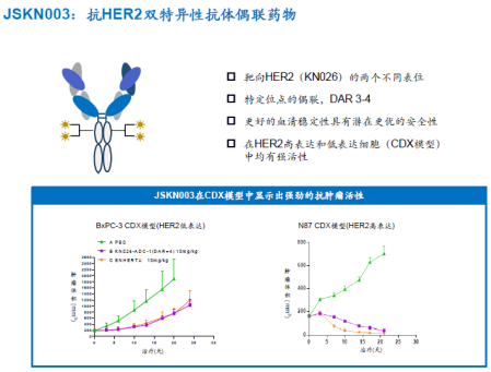 JSKN003是由康宁杰瑞自主研发的靶向HER2的双特异抗体偶联药物(ADC)。该ADC药物是在靶向HER2双抗KN026基础上设计和改造而来的,可同时结合 HER2的两个非重叠表位,导致双HER2信号阻断,达到曲妥珠单抗和帕妥珠单抗联用的效果,如:展示出更高的亲和力,以及在HER2阳性肿瘤细胞株中具备优效的肿瘤抑制作用。同时,抗体KN026对HER2中低表达肿瘤和曲妥珠单抗抗性细胞株也有抑制作用。