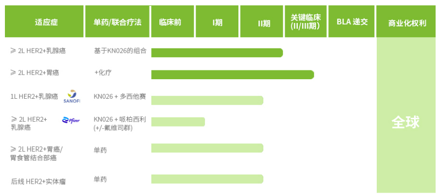双抗KN026已于2018年分别获得NMPA和FDA的批准,目前正在中国开展多项I/II期临床试验,同时在美国推进I期临床试验。I期临床试验结果表明,KN026具有良好的耐受性和安全性,在多线抗HER2治疗后进展的HER2阳性乳腺癌患者中表现出了显著的抗肿瘤活性。晚期胃癌后线的II期研究中,KN026在HER2高表达和中低表达的患者中显示了初步的疗效。