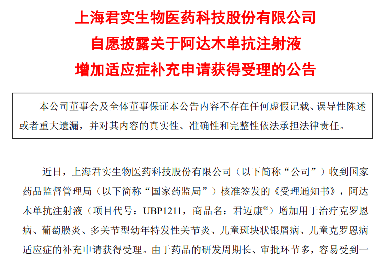 8月17日,君实生物/迈威生物共同宣布,NMPA已受理阿达木单抗注射液(君迈康)的增加适应症的补充申请,用于治疗克罗恩病、葡萄膜炎、多关节型幼年特发性关节炎、儿童斑块状银屑病、儿童克罗恩病。