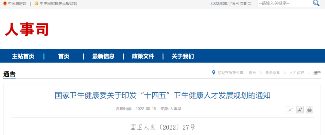 近日,国家卫生健康委印发《“十四五”卫生健康人才发展规划》。《规划》中提出,“十四五”期间,我国卫生健康人才发展的总体目标是:促进人才服务能力提高与结构优化,完善人才管理制度机制,营造人才发展的良好环境。