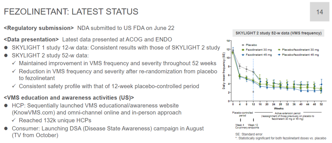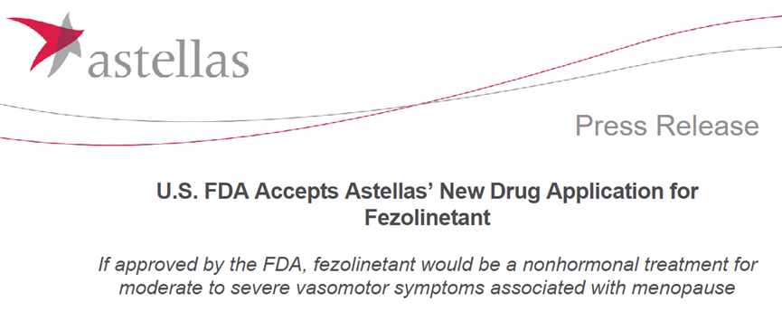 8月18日,安斯泰来公告宣布,神经激肽3受体拮抗剂fezolinetant的新药上市申请(NDA)已获FDA受理并获优先审查认定,PDUFA日期定为2023年2月22日。本次申请的适应症为与更年期相关的中度至重度血管舒缩症状(VMS)。一旦获批,fezolinetant将成为首款治疗VMS的非激素疗法。