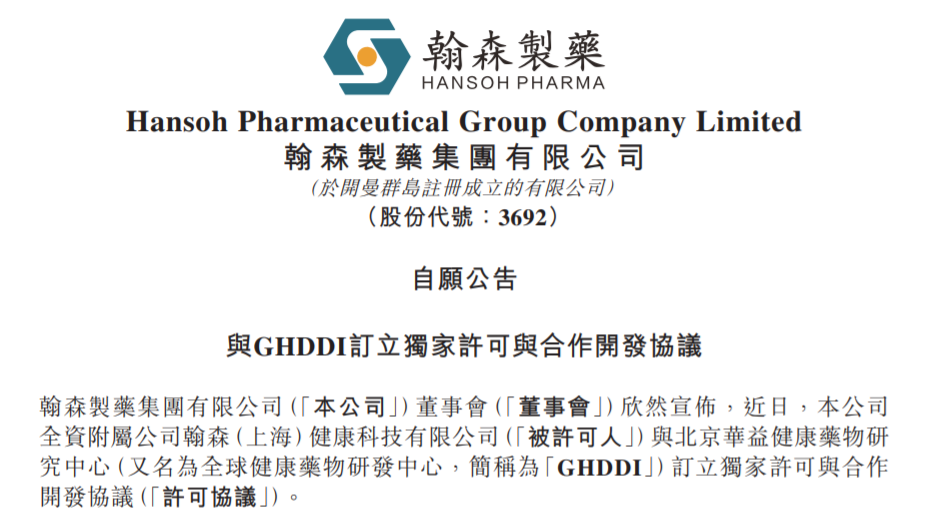 根据许可协议,翰森制药将获得抗新型冠状病毒(SARS-CoV-2)候选新药GDI4405系列于全球开发、生产及商业化的独家权利,同时向GHDDI支付人民币1200万元首付款及最多人民币16.8亿元的开发、注册及基于销售的商业化里程碑潜在付款,以及基于净销售额的分级特许权使用费。