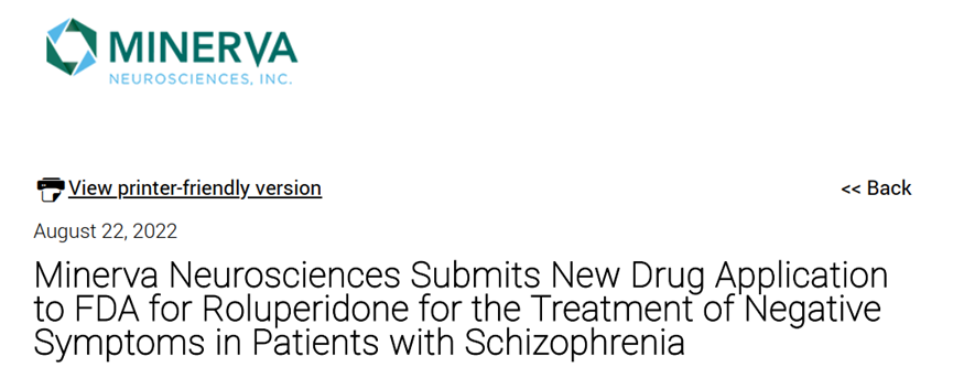 8月22日,Minerva Neurosciences公告宣布已向FDA提交roluperidone的新药申请(NDA),用于治疗精神分裂症患者的阴性症状。