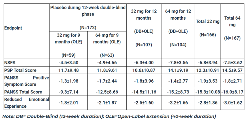 MIN-101C07研究的结果显示,第40周时,在改良意向性治疗(mITT)人群中,roluperidone(64mg)组患者的NSFS评分改善(p≤0.044)和个人和社会表现(PSP)总分改善(p≤0.017)均显著优于安慰剂组。