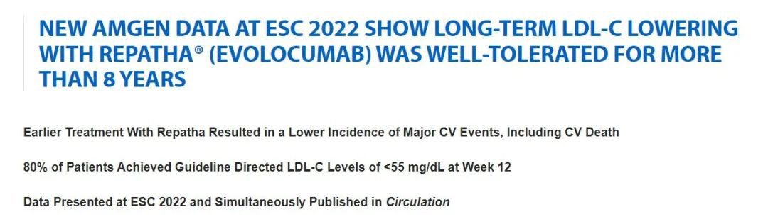 8月29日,安进更新了III期FOURIER-OLE研究的数据,长期使用依洛尤单抗(商品名:瑞百安、Repatha)可显著降低动脉粥样硬化性心血管疾病(ASCVD)患者的低密度脂蛋白胆固醇(LDL-C)水平,安全性和耐受性良好。最新的结果在2022 ESC大会(欧洲心脏病学会年会)上公布,并同步发表于《循环》杂志。
