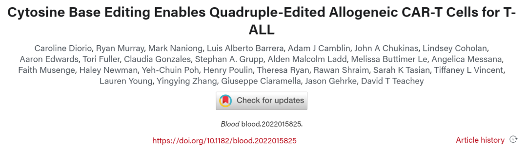 2022年5月16日,碱基编辑公司 Beam Therapeutics 与美国费城儿童医院合作,在血液学顶级期刊 Blood 发表了题为:Cytosine Base Editing Enables Quadruple-Edited Allogeneic CAR-T Cells for T-ALL 的研究论文。