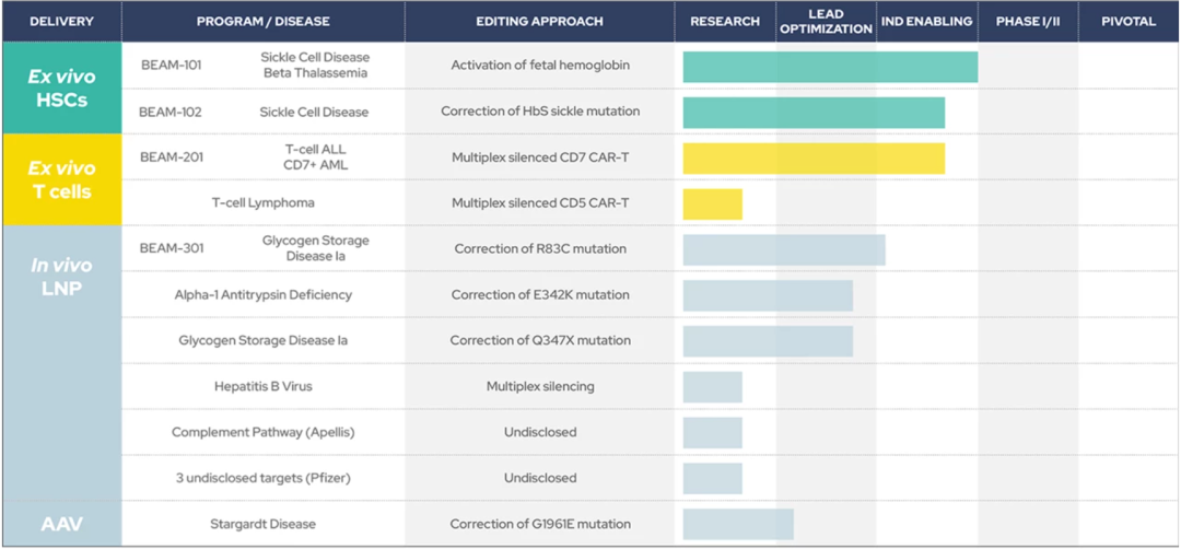 体外造血干细胞疗法:共有2款,分别是治疗镰状细胞病和β-地中海贫血的BEAM-101,以及治疗镰状细胞病的BEAM-102。这两款疗法均已IND申报,其中BEAM-101已于近日完成了首个患者的临床给药。