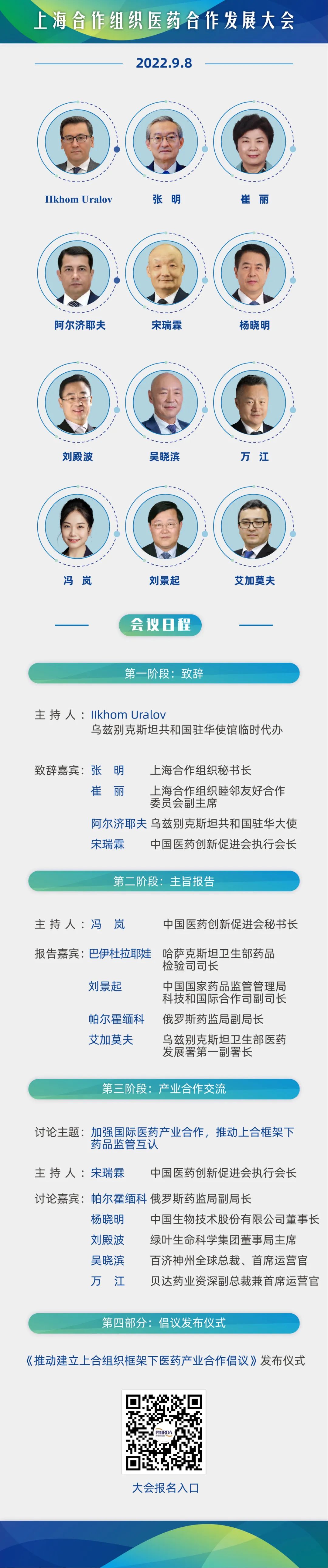 由上海合作组织睦邻友好合作委员会、上海合作组织秘书处、乌兹别克斯坦共和国驻华大使馆和中国医药创新促进会共同主办的“上海合作组织医药合作发展大会”将于9月8日在北京召开,同步进行线上直播。本次大会是首次在上合组织框架下举办的医药领域合作会议,将成为展示中国医药创新产品与创新成果,加强中国与上合组织国家间医药卫生领域交流的重要平台,对未来上合组织内建立紧密的合作关系具有积极意义。