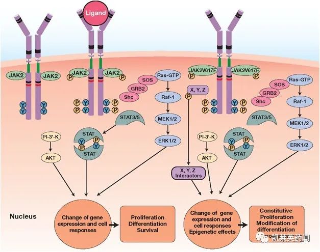 JAK 是一类非受体型酪氨酸激酶,包括JAK1, JAK2, JAK3, 和Tyk2 四个成员。JAK和其下游的效应器、信号转导及转录激活蛋白 (STATs) 形成了重要的细胞因子信号传导途径——JAK-STAT 通路。该通路的发现, 大大提高了研究者对基因调控的认识, 研究发现JAK-STAT 通路可由多种细胞因子、生长因子以及受体激活, 参与细胞增殖、分化、凋亡、血管生成以及免疫调节等过程。JAK抑制剂主要被开发用来治疗类风湿关节炎、银屑病关节炎、强直性脊柱炎以及特应性皮炎等自身免疫性疾病。