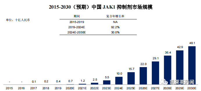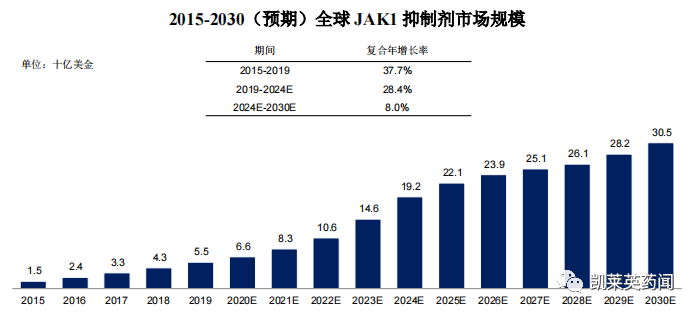 以JAK1 抑制剂为例。根据弗若斯特沙利文分析,2019 年全球JAK1 抑制剂市场规模约为55 亿美元,预计2024 年和2030年将快速增长至192 亿美元和305 亿美元,2019年至2024 年及2024 年至2030 年的年复合增长率分别为28.4%和8.0%。