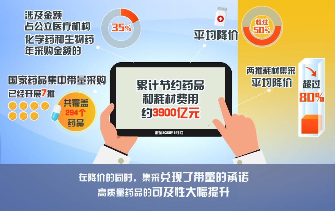 从常见病、慢性病用药到重大疾病用药、罕见病用药,从冠脉支架、人工关节到骨科耗材、种植牙,集采的重点始终聚焦人民群众最迫切的需求。记者从国家医保局获悉,截至今年8月底,国家药品集中带量采购已经开展7批,共覆盖294个药品,涉及金额占公立医疗机构化学药和生物药年采购金额的35%,平均降价超过50%,两批耗材集采平均降价超过80%。集采改革以来,累计节约药品和耗材费用约3900亿元。