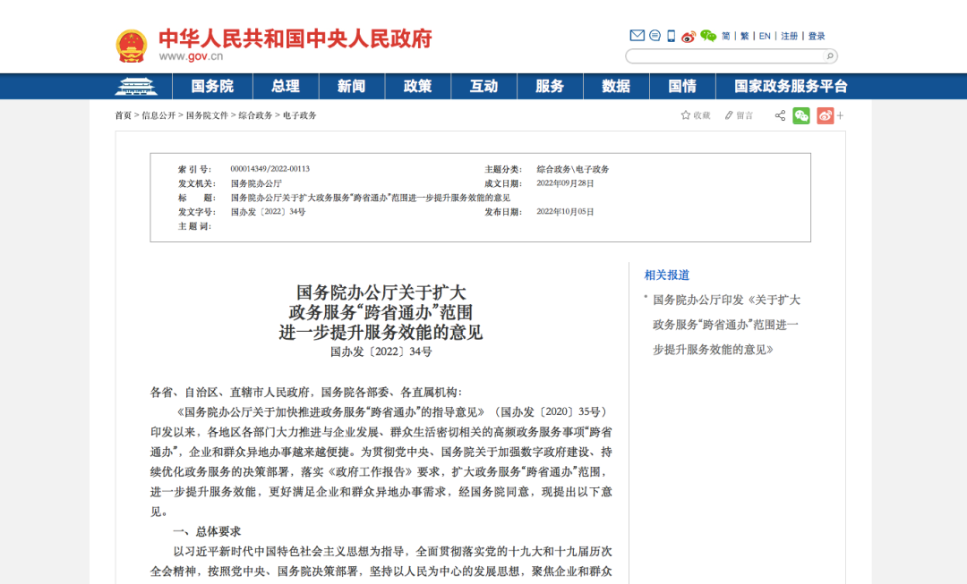 国务院办公厅关于扩大政务服务“跨省通办”范围进一步提升服务效能的意见