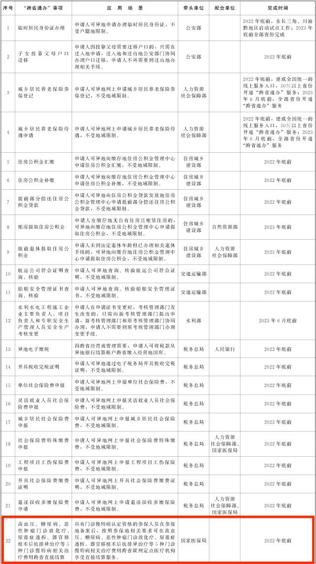 在全国政务服务“跨省通办”新增任务清单中可以看到,由国家医保局牵头,在2022年底前实现高血压、糖尿病、恶性肿瘤门诊放化疗、尿毒症透析、器官移植术后抗排异治疗等5种门诊慢特病相关治疗费用跨省直接结算服务。