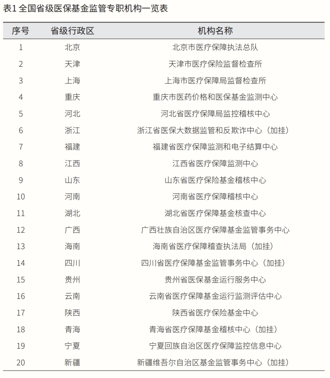 工作体制改革。截至目前,全国各省级医保部门通过新设或加挂牌子的方式建立20 家省级专职机构 (见表 1) 。其中,上海、天津、北京等地为探索建设医保基金监管行政执法队伍,全面推进医疗保障行政执法体制改革向纵深发展提供新的实践经验。上海市最早建立专职机构,2001 年成立上海市医疗保险监督检查所,2020 年 4 月,上海市以政府规章形式出台《上海市基本医疗保险监督管理办法》,从法律上确立了监督检查所的行政执法合法地位,2021 年更名为上海市医疗保障局监督检查所。天津市医疗保险监督检查所成立于 2012 年 6 月,依托政策制定、经办管理和执法监督“三位一体”模式,并通过信息化手段对全市就医诊疗行为实行“无盲区”的实时监控,率先实现了网络执法、精准执法和移动执法。北京市医疗保障执法总队核定编制 55人,参照市场监管部门执法建设模式,通过内设执法一队、二队、三队开展行政执法工作。