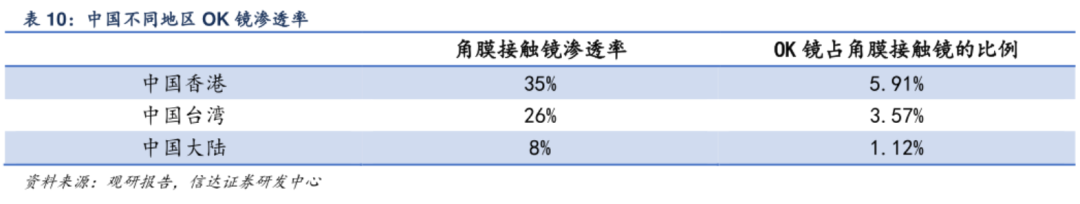 据信达证券研报数据显示,中国大陆的OK镜渗透率远低于中国台湾和中国香港地区。从角膜接触镜(隐形眼镜+OK镜等)的渗透率来看,中国台湾和中国香港地区的渗透率分别是26%和35%,而中国大陆只有8%。从OK镜占角膜接触镜的比例来看,中国台湾和中国香港地区分别是3.57%和5.91%,中国大陆只有1.12%。OK镜一旦纳入集采,推广至全国,将大大提升其渗透率。