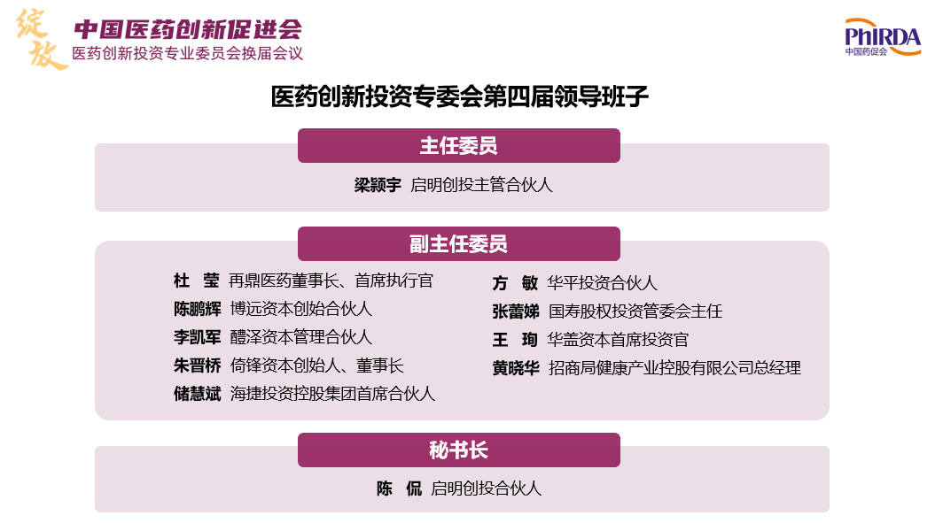 再鼎医药董事长兼首席执行官杜莹,博远资本创始合伙人陈鹏辉,醴泽资本管理合伙人李凯军,倚锋资本创始人、董事长朱晋桥,海捷投资首席合伙人储慧斌,华平投资合伙人方敏,国寿股权投资管委会/投委会主任张蕾娣,华盖资本首席投资官王珣和招商局健康产业控股有限公司总经理黄晓华当选投资专委会第四届副主任委员;