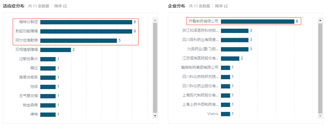 据 Insight 数据库显示,当前国内共 25 个口溶膜剂 2 类改良型新药,治疗领域来看显然对精神领域着墨颇多,居于前三位的适应症分别为:精神分裂症、勃起功能障碍、阿尔兹海默病。齐鲁制药显然是这一领域的佼佼者,坐拥 8 个项目,如今已经逐渐开花结果。