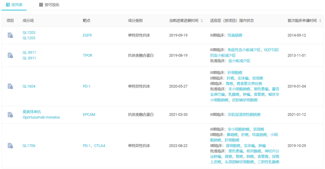 处于 III 期临床的 5 款新药均为生物药。药物类别上讲包括 2 款单抗、2 款融合蛋白、1 款单抗复方;治疗领域来看,4 款均为肿瘤药,TPOR 融合蛋白 QL0911 也能同抗肿瘤药物形成联动,用于化疗引起的血小板减少症。