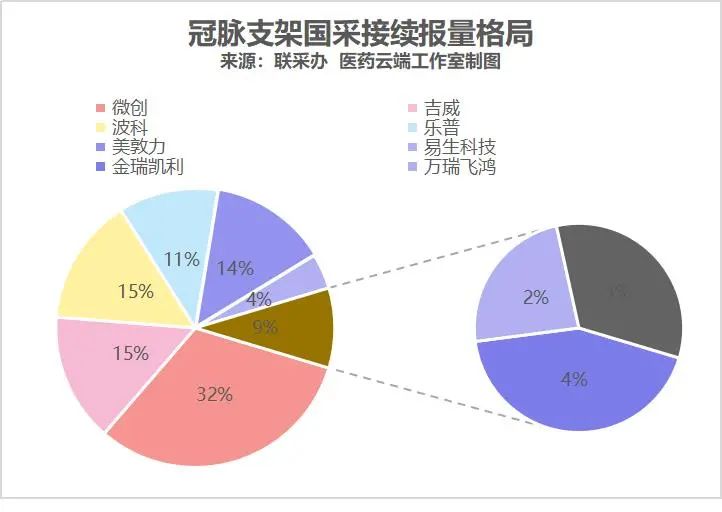 上次集采全场报价最低的吉威医疗(报价469元/个),之前集采中选后分得9.4%的采购量,此次接续报量占比为14.91%,有了大幅度的增长,以价换量还是获得了成效。