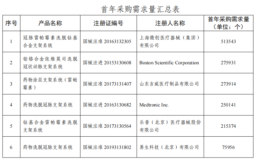 此次冠脉支架接续,首年采购需求量为1865057个,包括了11个厂家(外企4家,国内企业7家)。