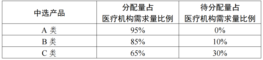 第二步是解决医疗机构报量但未中选的采购量分配问题,报量但未中选需求量的95%+中选产品待分配量(也就是上表中第三列的那部分数量)形成剩余量,这部分量由医疗机构分配给A类产品(不得少于剩余量的50%)及自己报过量中价格最低的产品。