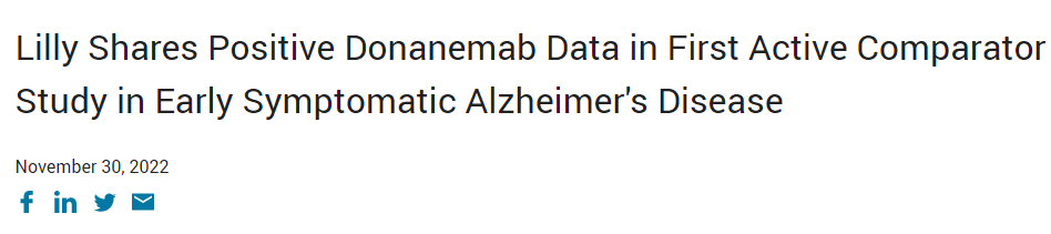 2022年11月30日,礼来公布其药物donanemab达III期试验达6个月所有主要终点和次要终点,为早期症状性阿尔茨海默病患者的淀粉样蛋白斑块清除提供了首个Aduhelm头对头比较数据。