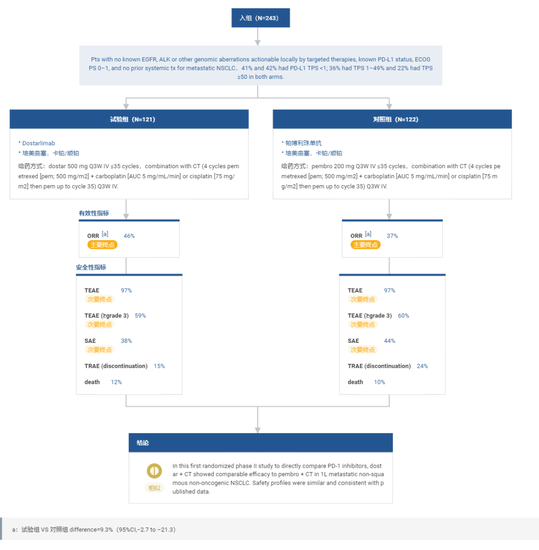 PERLA 研究共纳入了 243 例患者,这些患者无 EGFR、ALK 及其他靶向疗法可治疗的基因突变,且既往未接受过针对转移性 NSCLC 的前线全身疗法。患者按 1:1 随机分配,分别接受 Jemperli 或帕博利珠单抗联用培美曲塞 + 铂类化疗(卡铂/顺铂)。主要终点为 BICR 评估的 ORR,次要终点为安全性数据。疗效方面,Jemperli + 化疗治疗的 ORR 为 46%,包括 2 例完全缓解(CR,2%)和 54 例部分缓解(PR,45%);而 K 药 + 化疗的 ORR 为 37%,包括 3 例 CR(2%)和 42 例 PR(34%)。次要终点 PFS、针对 PD-L1 不同表达状态的亚组分析以及探索性终点 DOR 将在会议中披露详细数据。PERLA 研究最新结果 / Insight 数据库