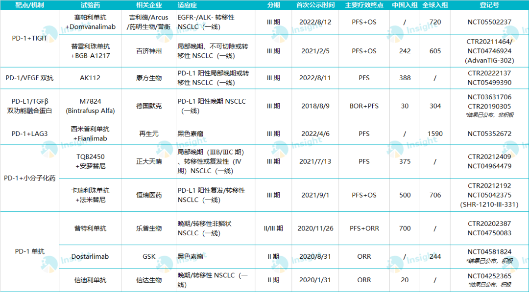欢迎点击文末「阅读原文」,领取 Insight 数据库免费试用账号作为一项 II 期临床,PERLA 研究的成功可能不能为 GSK 提供实质性的获批依据,该公司也表示并不会基于这项头对头积极数据提交监管申请,不过作为少见的与 K 药正面对撞的头对头临床试验,其积极结果仍然为 Jemperli 增加了更有力的临床证据。K 药早已成为包括 NSCLC 在内多个癌种的标准疗法,在这些适应症之上无论是单药对撞、还是开发联用方案,都避免不了与其直接 PK。据 Insight 不完全整理,当前除了 GSK 之外,信达的信迪利单抗、乐普的普特利单抗也登记了相应临床试验正面对决 K 药,前者也已经公布了积极临床数据。除此之外,其他正在进行中的 II 期及以上 K 药头对头临床试验还包括基于 PD-(L)1 的双抗/双功能融合蛋白、双免疫疗法、PD-(L)1 + 小分子化药等。头对头 K 药的 II 期及以上临床试验