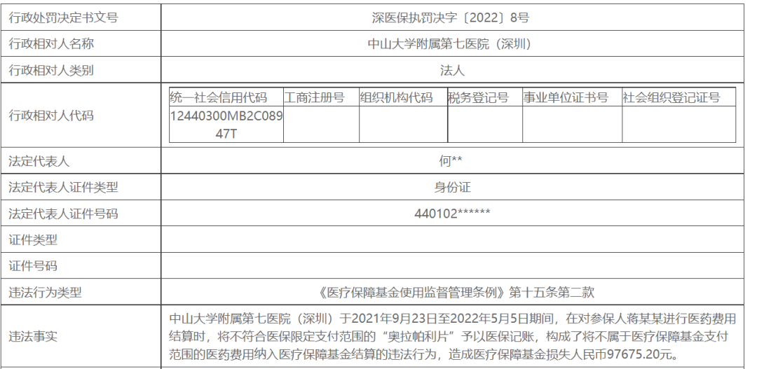 2022年9月7日,深圳医保局的公开处罚显示,中山大学附属第七医院(深圳)于2021年9月23日至2022年5月5日期间,在对参保人蒋某某进行医药费用结算时,将不符合医保限定支付范围的“奥拉帕利片”予以医保记账,构成了将不属于医疗保障基金支付范围的医药费用纳入医疗保障基金结算的违法行为,造成医疗保障基金损失人民币97675.20元。该医院被处以等额罚款。