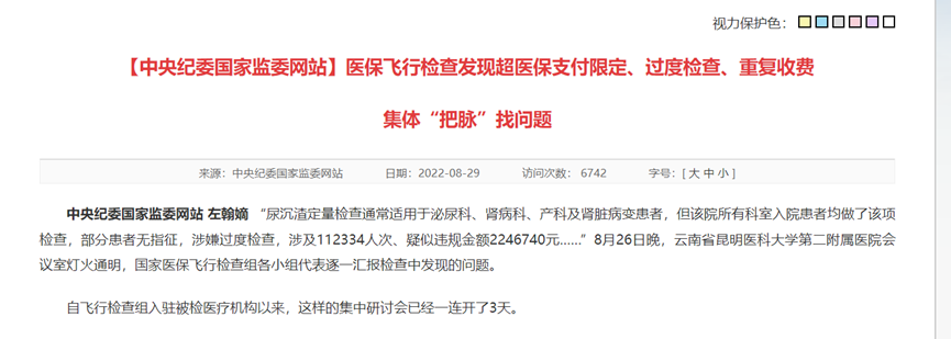 2022年5月,国家医保局、财政部、卫健委和中医药管理局等4部门联合下发《关于开展2022年度医疗保障基金飞行检查工作的通知》,6月23日,国家医保局举办飞行检查视频培训班,7月8日,2022年度国家飞行检查正式开始。7月,中纪委国家监委的网站接连刊发文章,对国家医保局在云南的飞行检查进行详细播报,在对飞检结果披露中,超医保支付限定被放在了重要位置。