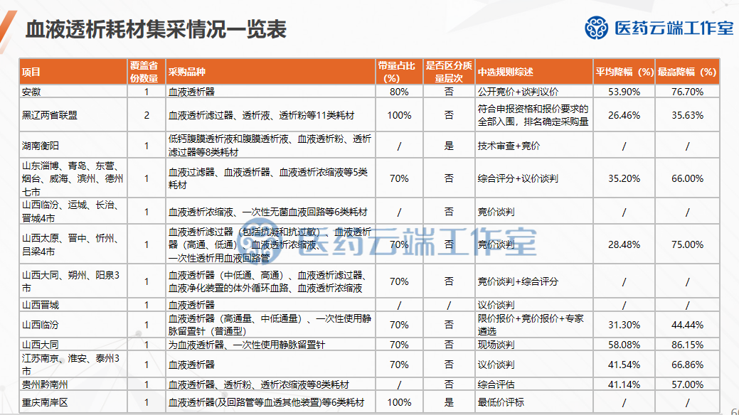 此外,还有山东7市、山西4市、山西3市等联盟集采。其中,山东7市联盟血液透析产品采购数量为577.3万个,最高降幅为66%,平均降幅为35.2%;山西3市5类11个品种、130余个产品,平均降幅为28.48%,最高降幅为75%,预计年可节约费用1057.91万元。