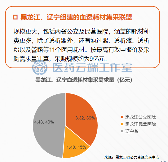 与安徽针对透析器集采相比,黑龙江、辽宁组建的血透耗材集采联盟规模更大,包括两省公立及民营医院,涵盖的耗材种类更多,除了透析器外,还有滤过器、透析液、透析粉以及管路等11个医用耗材。按最高有效申报价及采购需求量计算,采购规模约为9亿元。