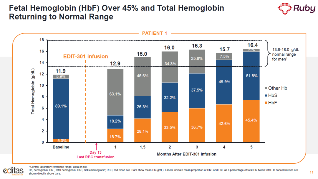 在接受治疗5个月后,第一名患者的总血红蛋白水平为16.4 g/dL,其中HbF占比为45.4%。超过95%的血红细胞中的HbF水平增加,血红细胞中的HbF水平超过了抑制血红细胞镰刀化的阈值。