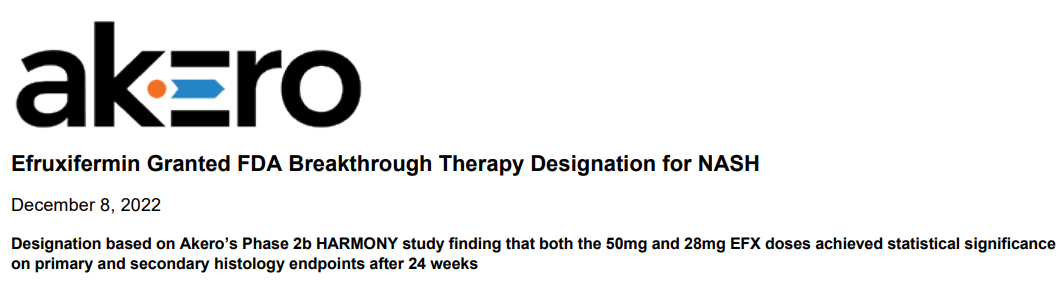 12月8日,Akero Therapeutics公司宣布FDA授予efruxifermin (EFX) 治疗非酒精性脂肪性肝炎 (NASH) 的突破性疗法认定。去年10月,EFX已获FDA授予的快速通道资格认定。
