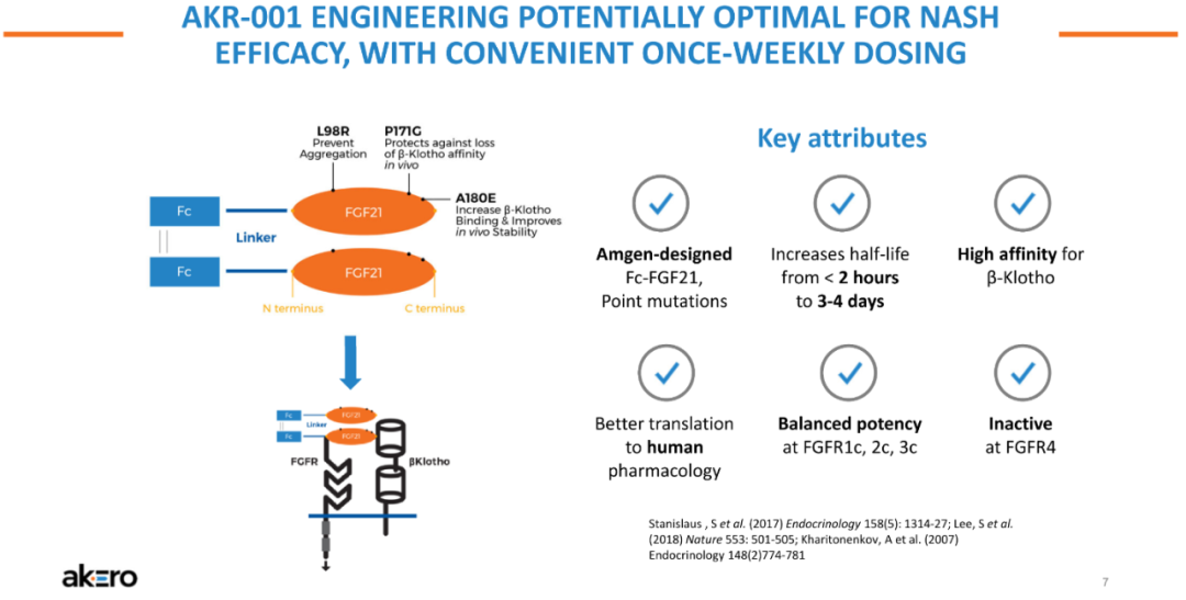 NASH是非酒精性脂肪性肝病的一种严重形式,其特征在于脂肪在肝脏中过度堆积,对肝细胞产生应激和损伤,引起炎症和纤维化,进而发展为肝硬化、肝功能衰竭、癌症甚至死亡。对整个医药行业来说,NASH一直是个难题,其需求远未得到满足,目前尚无治愈或特异性的治疗方法。据估计,到2026年,NASH市场将达到183亿美元。Efruxifermin(AKR-001)是通过模仿天然FGF21的生物活性谱设计而成,融合Fc延长半衰期,同时替换了FGF21序列中的某些氨基酸;半衰期达到3-4天,可以实现每周1次或每2周1次皮下注射给药。