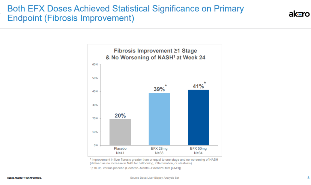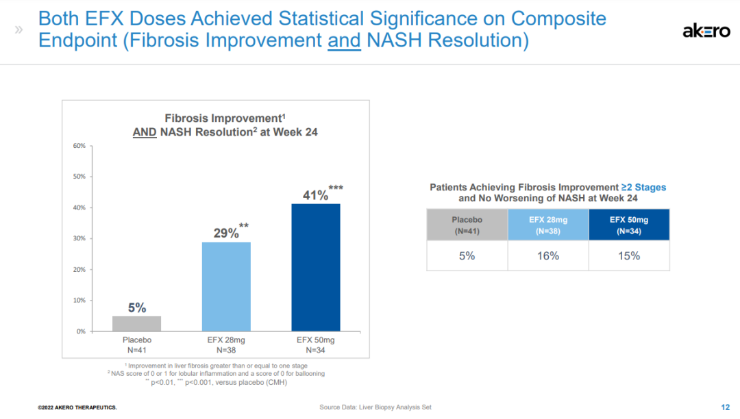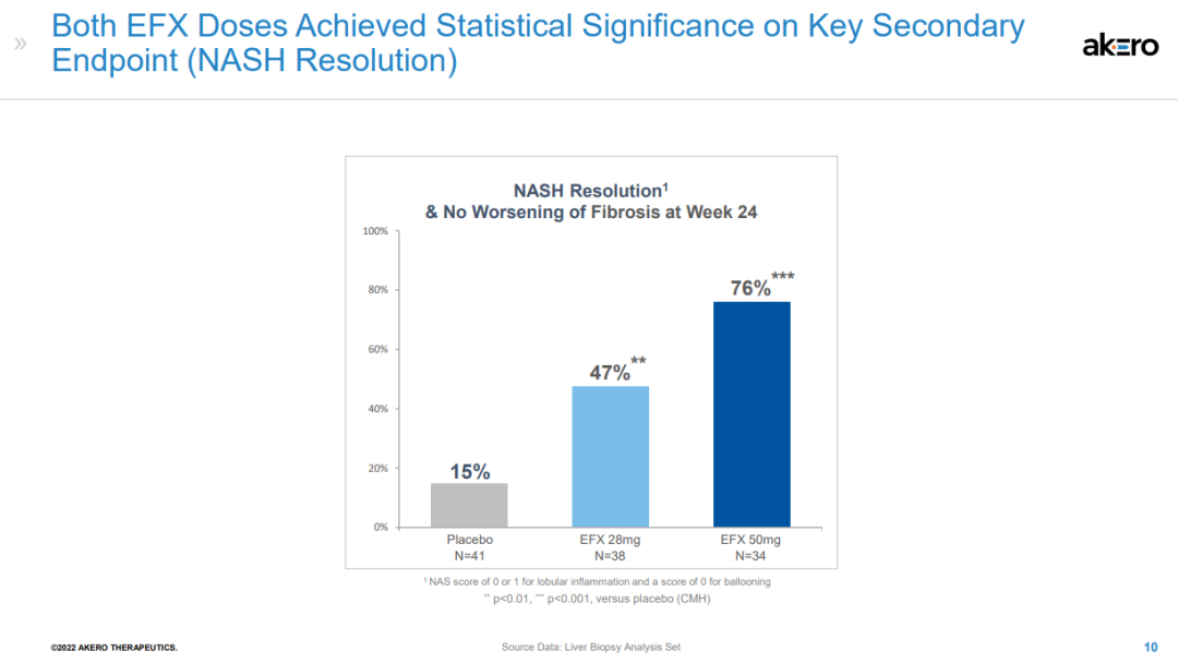 该研究还达到了多个关键次要终点。皮下注射EFX 28mg和50mg后,分别有47%和76%的患者在肝纤维化不恶化的情况下获得了NASH缓解,而安慰剂组为15%。