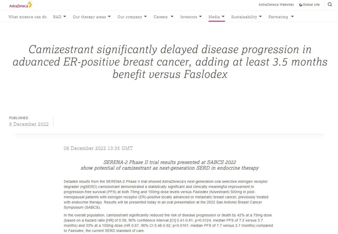 昨日,2022 年圣安东尼奥乳腺癌研讨会 (SABCS)上,阿斯利康(AstraZeneca)以报告形式公布其下一代口服选择性雌激素受体降解剂(ngSERD) camizestrant的SERENA-2 II 期试验的详细结果。
