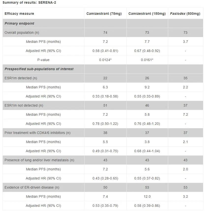 统计所有试验患者数据显示,与Faslodex相比,服用75mg剂量的camistrant可将疾病进展或死亡的风险降低42%(风险比[HR]为0.58,90%置信区间[CI]为0.41-0.81;p=0.0124;中位数无进展生存期PFS:7.2 vs 3.7个月;150mg剂量可将疾病进展或死亡的风险降低33%(HR:0.67,90%CI:0.48-0.92;p=0.0161;中位数PFS:7.2 vs 3.7个月) 。