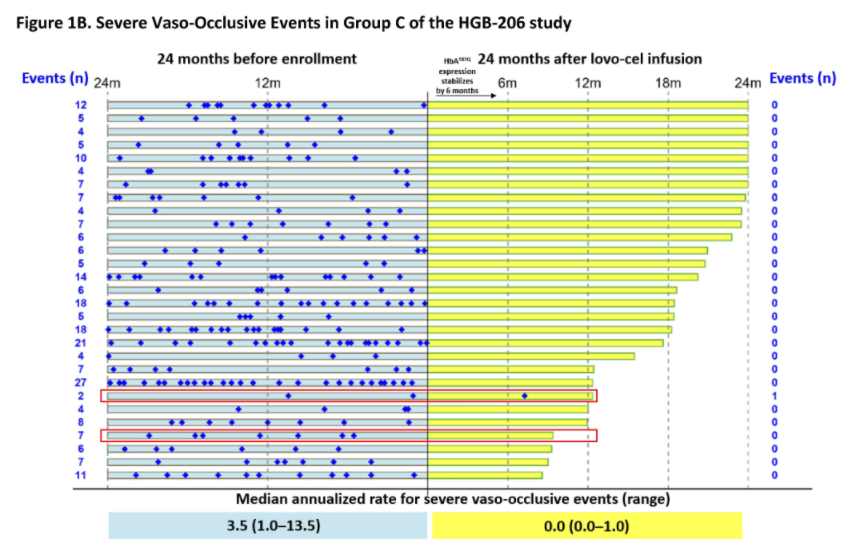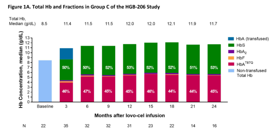 本次ASH年会蓝鸟生物公布了正在进行的I/II期HGB-206试验C组的最新数据。HGB-206研究是目前业内规模最大,随访时间最长,最成熟的SCD基因疗法临床试验之一。截至2022年8月,蓝鸟Lovo-cel的三项临床研究中,已有50名患者接受了治疗,患者随访时间长达7年,(中位数:37.7个月)。