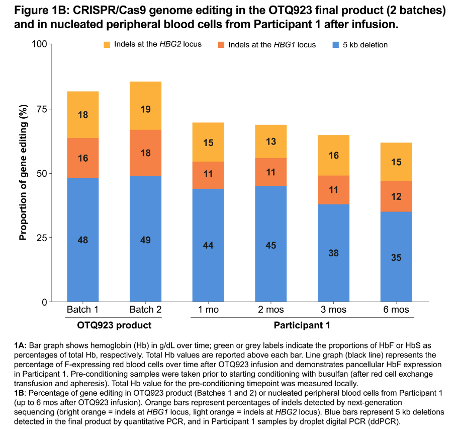 OTQ923是一种基于CRISPR/Cas9基因组编辑的体外自体干细胞(HSCs)疗法,用于治疗镰状细胞病(SCD)。本次ASH大会上公布的是OTQ923用于治疗镰状细胞病(SCD)的I/II期试验的最新数据。
