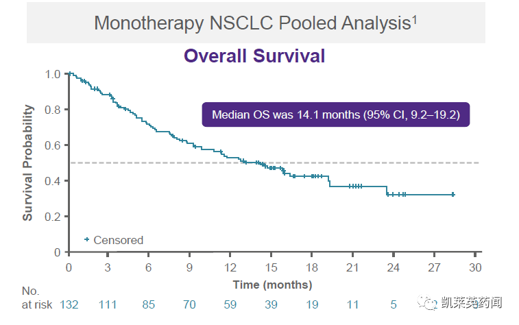 此外,在包括来自KRYSTAL-1研究的1/1b期NSCLC和注册2期NSCLC队列的汇总疗效分析(n=132)中,评估adagrasib单药每日口服2次治疗的效果,结果显示:ORR为44%,疾病控制率为81%,中位DOR为12.5个月(95%CI, 7.3-NE),中位总生存期为14.1个月(94%CI,9.2-19.2)。