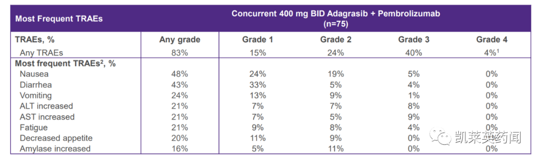 在不良反应上,在 366 名参加 KRYSTAL-1 和 KRYSTAL-12 的患者中,最常见的(≥25%)不良反应是恶心、腹泻、呕吐、疲劳、肌肉骨骼疼痛、肝毒性、肾功能损害、水肿、呼吸困难和食欲下降。由于不良反应,KRAZATI的永久性停药发生在13%的患者中。