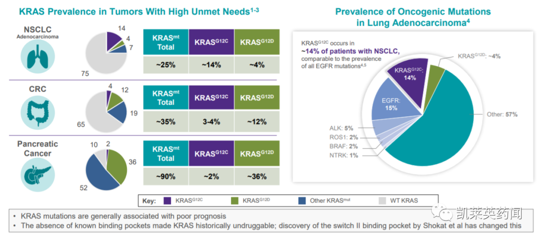 由于KRAS突变体的结构特点、信号通路的复杂性以及KRAS突变型肿瘤的耐药性,KRAS一度被称为“不可成药靶点”。其中,KRAS G12C作为一种特定的KRAS亚突变,是第12个密码子的甘氨酸被半胱氨酸取代,约占所有KRAS突变的44%,其中非小细胞肺癌腺癌中最常见,占14%,其次是大肠腺癌占3-4%,胰腺癌占2%,全球每年超过100000人确诊为KRAS G12C突变。