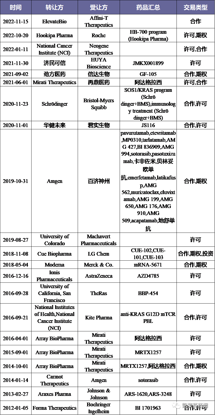 随着KRAS抑制剂研究不断取得新进展,近年来越来越多的企业开始布局KRAS抑制剂领域,探索新的组合疗法, 下表是有关KRAS近年来的交易情况: