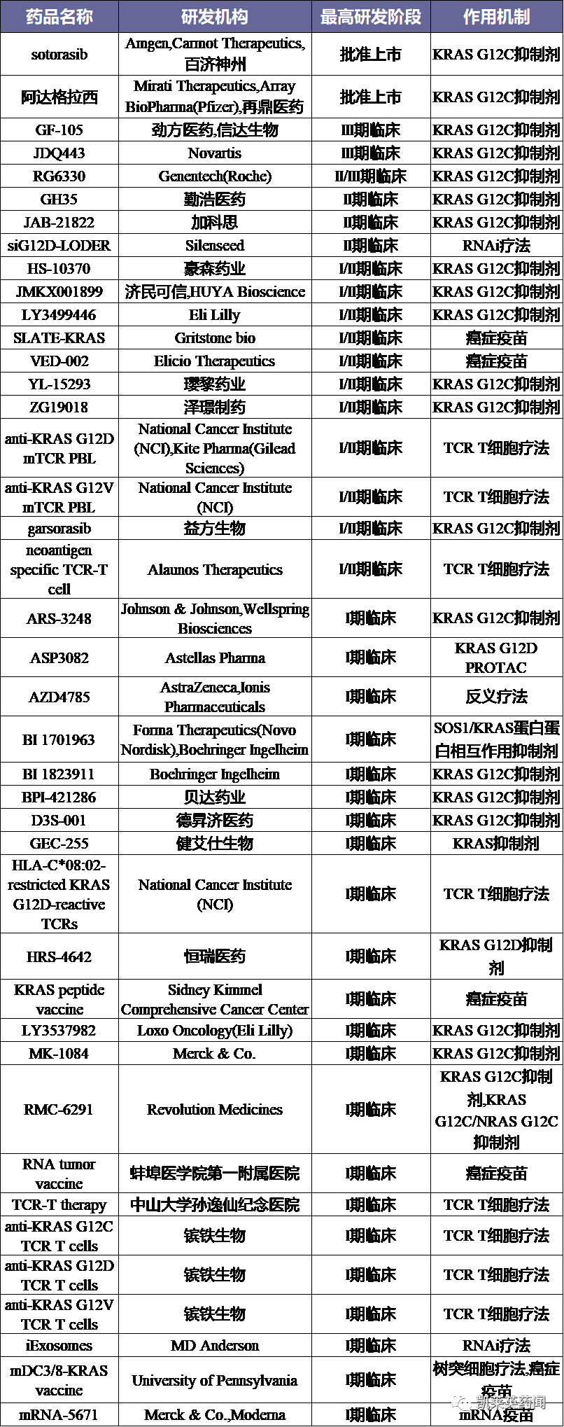 除KRAZATI外,目前全球上市的另一款KRAS抑制剂是安进的 Lumakras(sotorasib)。根据Fierce Pharma预测, 2025年的sotorasib预测市场为13亿美元,而adagrasib在2026年预测市场可达17亿美元。将全球处于临床以上阶段的KRAS药物统计如下: