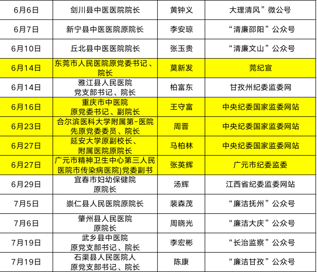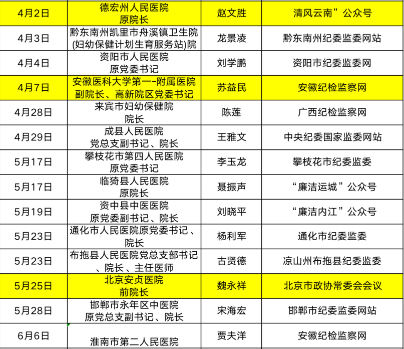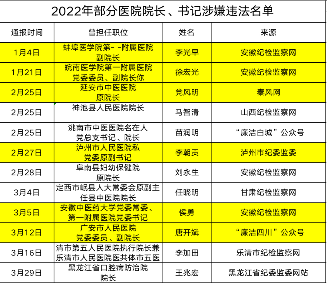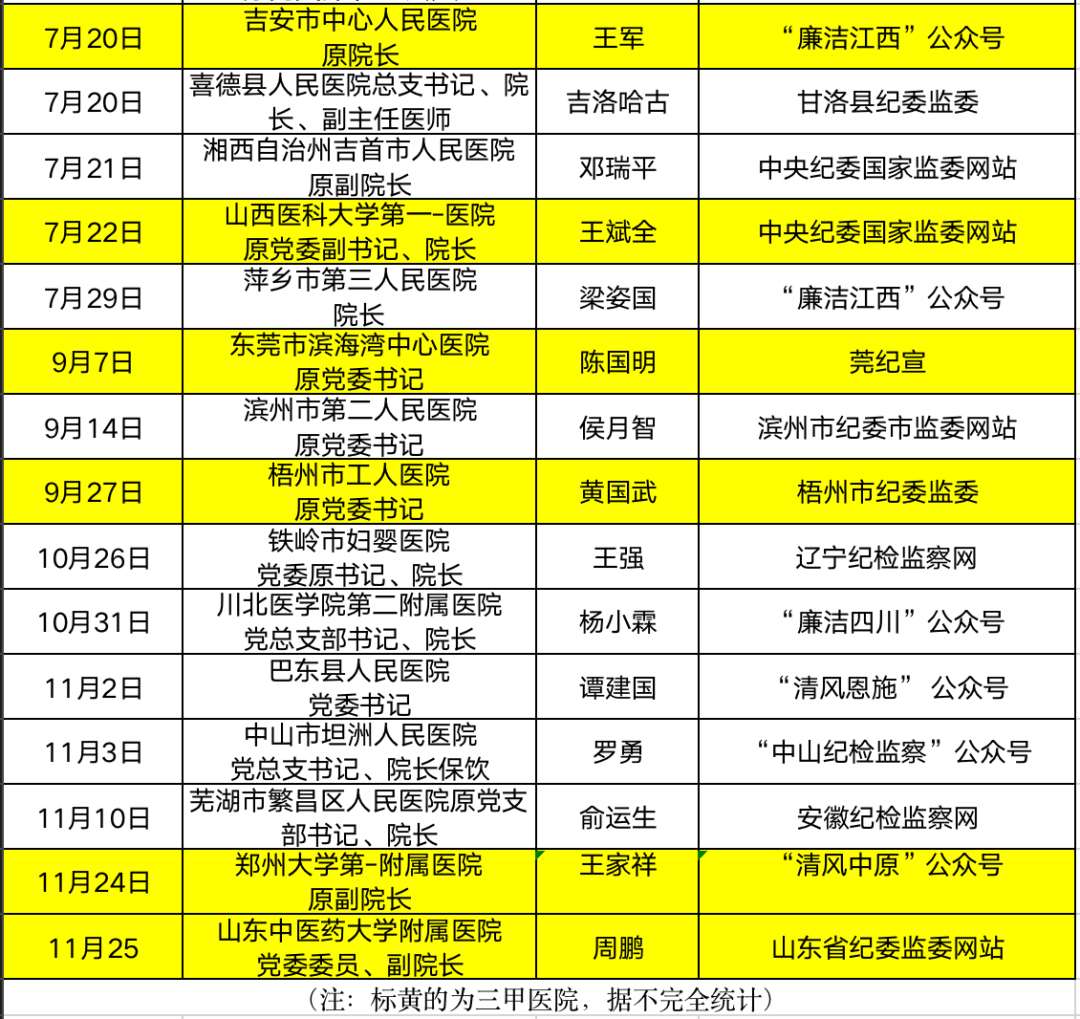 今年以来,中央纪委国家监委已经多次密集通报医疗反腐、药品回扣等问题,医药代表、药企等相关人员被拎出的同时,不少三甲医院的“一把手”也相继落马。根据国家及各地纪检监察部门公示的信息不完全统计,截止11月,各地累计已经有超50位医院院长、书记被查,其中来自三甲医院的领导超过20位。