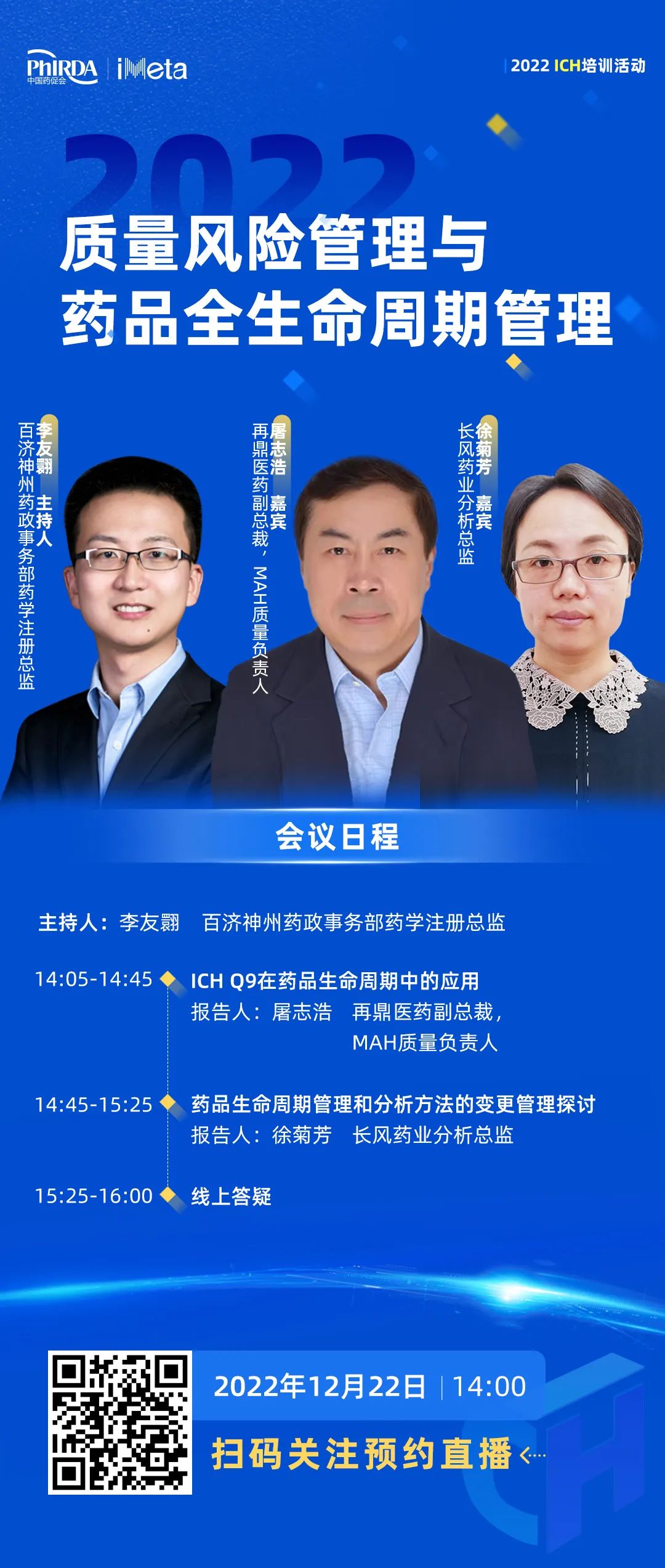 第二期中国医药创新促进会ICH指导原则系列培训将于12月22日14:00线上直播,本期培训活动主题为“质量风险管理与药品全生命周期管理”,特邀药促会IFPMA ICH Q9(R1)组长、再鼎医药副总裁、MAH质量负责人屠志浩与Q2(R2)/Q14组长、长风药业分析总监徐菊芳担任主讲人,M4Q(R2)候补组长、百济神州药政事务部药学注册总监李友翾担任主持人。届时三位业界专家将围绕质量风险管理与药品全生命周期管理的要点和难点进行案例分析与深度解读,并对观众提出的问题予以解答和讨论,欢迎大家预约“中国医药创新促进会”视频号直播,实时参与线上交流互动。