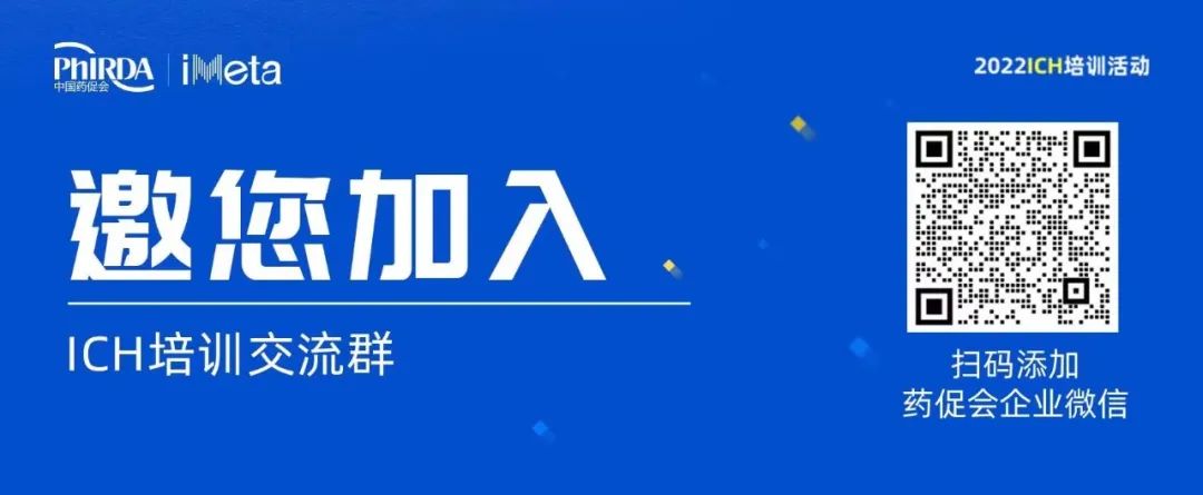 主办方创建了“ICH培训交流群”,欢迎大家扫描下方二维码加入,直播过程中可实时互动,并获取更多ICH指导原则的培训活动与相关资讯。