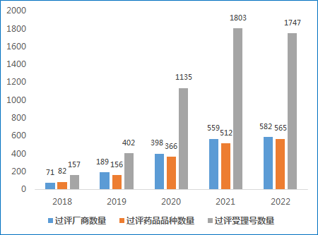 随着一致性评价的推进,过评药品及企业数呈逐年递增的趋势。过评受理号数量从2018年的157个,增加到2022年的1747个;过评药品品种数量从2018年的82种,增加到2022年的565种。