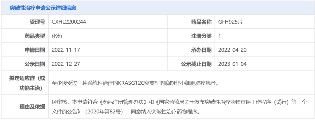 今日(12月27日),中国国家药品监督管理局药品审评中心(CDE)官网最新公示,信达生物申请的1类新药GFH925片拟纳入突破性治疗品种,拟用于至少接受过一种系统性治疗的KRAS G12C突变型的晚期非小细胞肺癌(NSCLC)患者。公开资料显示,GFH925是劲方医药研发的一款KRAS G12C抑制剂,信达生物通过合作获得了它在大中华区的开发和商业化权利。